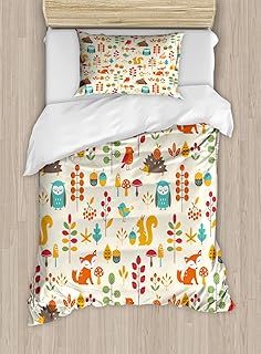 子供布団カバーセットby Ambesonne、子供キュート秋パターンフクロウFoxリス鳥動物の葉Artsy印刷、装飾寝具セット枕のカバー、マルチカラー TWIN / TWIN XL nev_29041_twin