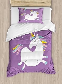 ユニコーンホームとキッズインテリア布団カバーセットby Ambesonne andレインボークラウドで、Mythical動物図Fairyイメージ、装飾寝具セットwithピロー、パープルホワイト TWIN / TWIN XL nev_19510_twin