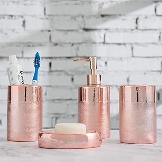 MyGift 4ピース ローズゴールド モダン テクスチャード セラミック バスルームセット ソープディッシュ、ポンプディスペンサー、歯ブラシホルダー&タンブラー付き